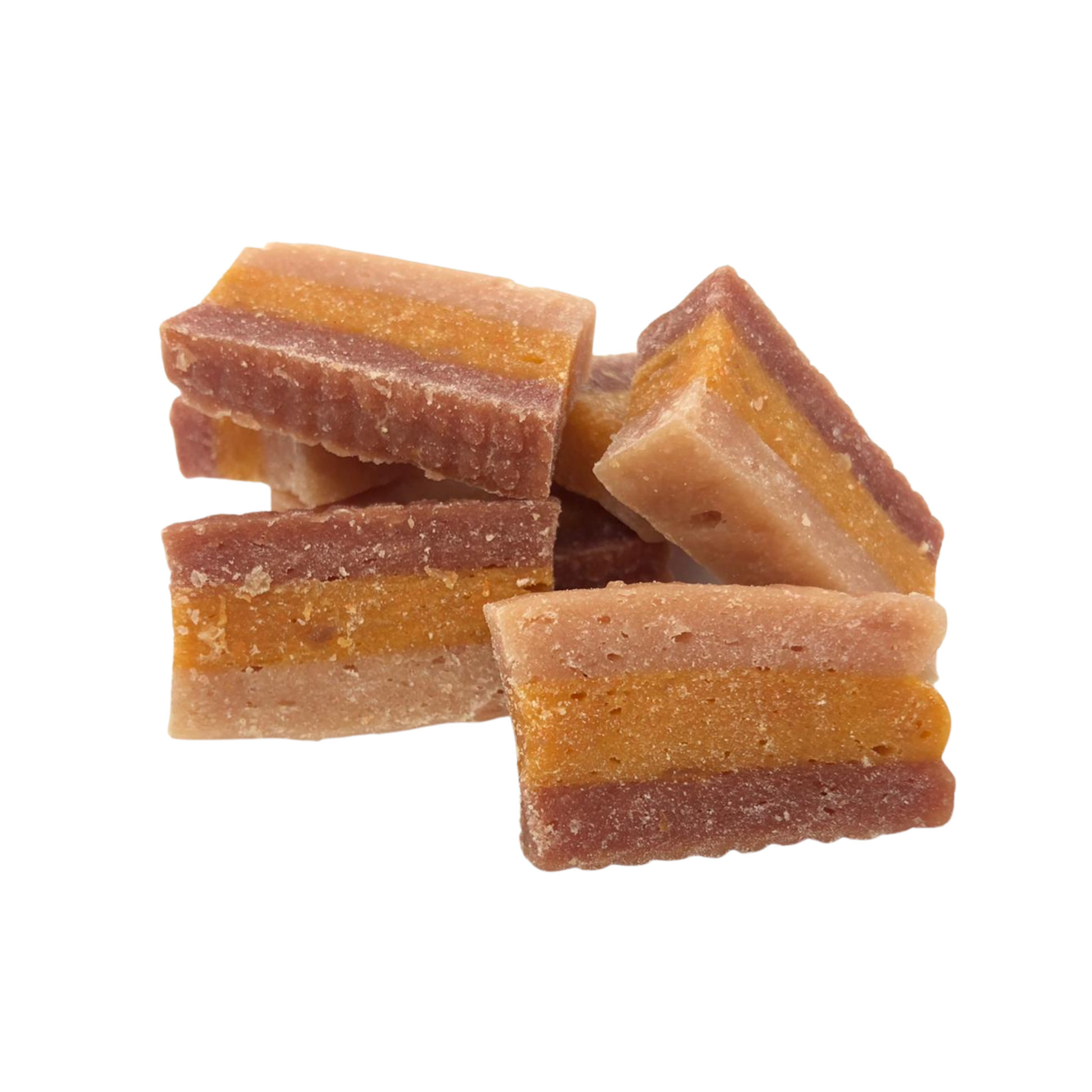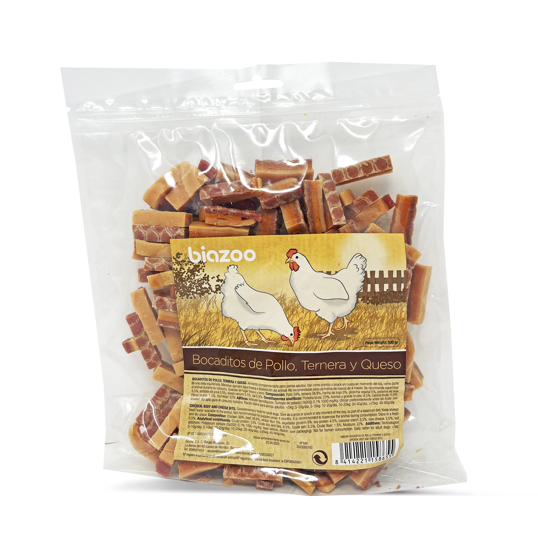 Estos deliciosos bocaditos combinan pollo, ternera y queso en una receta irresistible con un contenido cárnico cercano al 80%, lo que los convierte en una fuente de proteína animal de alta calidad para complementar la dieta de tu perro.
